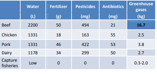 Table 1. Amount of water, fertilizer, pesticides, antibiotics and greenhouse gas emissions needed to produce one portion containing 40g of protein, for beef, chicken, pork, dairy and capture fisheries.